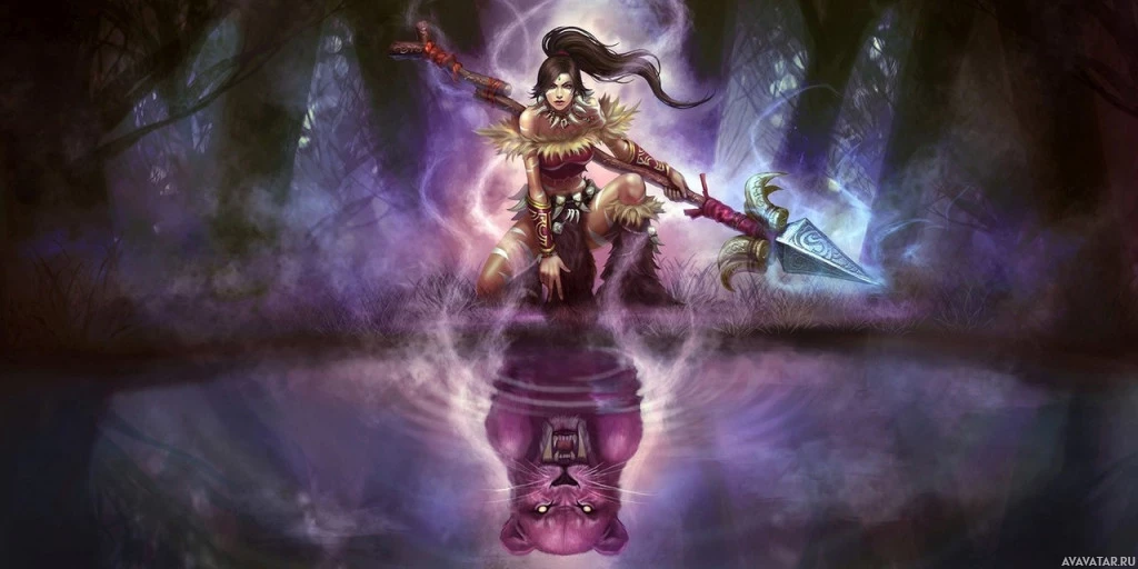 a fantasy character, who appears to be a female with brown hair. She is standing in an ethereal or magical setting, possibly a forest or clearing with mist and trees around her. She's holding a staff that has