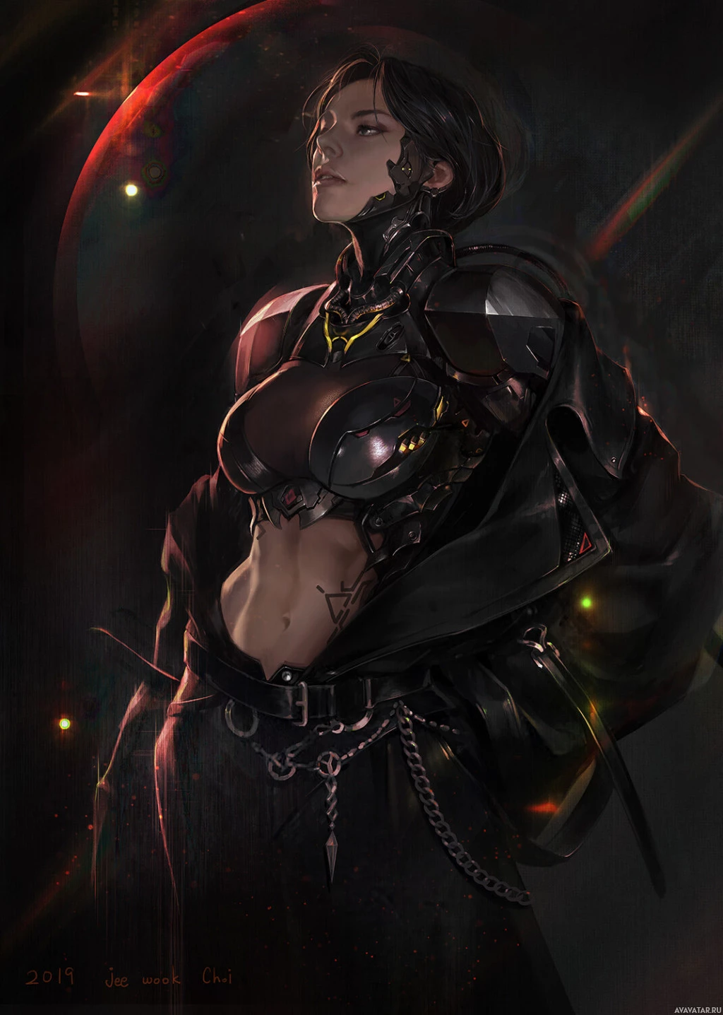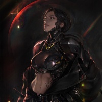 advanced technology or machinery. The background suggests a space environment, possibly indicating that this character is set in a universe where