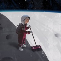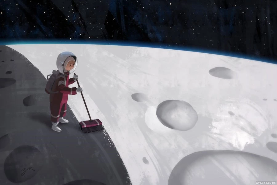 a space suit and helmet with reflective visors, which is typical attire for an astronaut in a vacuum environment. There's a broomstick in the astronaut's hand, suggesting that they might be tidying up the area, perhaps after some
