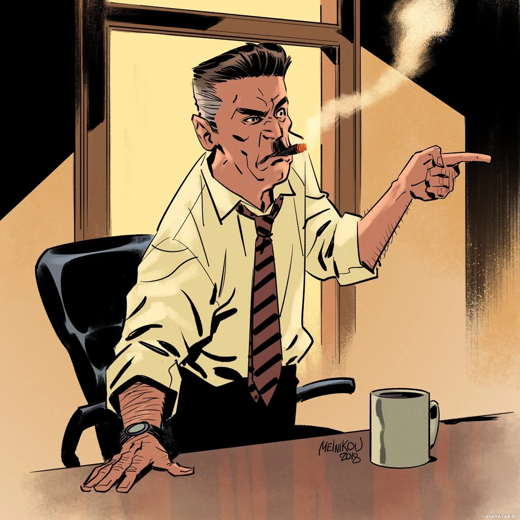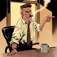 a coffee cup on his desk, suggesting he might be taking a break or having a meal while working. The style of the image suggests it could be from a comic book or graphic novel, as indicated by the artwork and