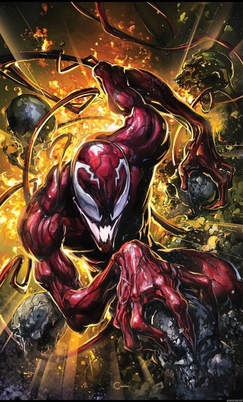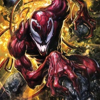 book series "Spider-Man," specifically the supervillain known as Carnage. This character is often associated with Spider-Man's nemesis, Venom, and is typically portrayed as a ruthless serial killer who wields his own