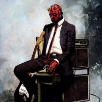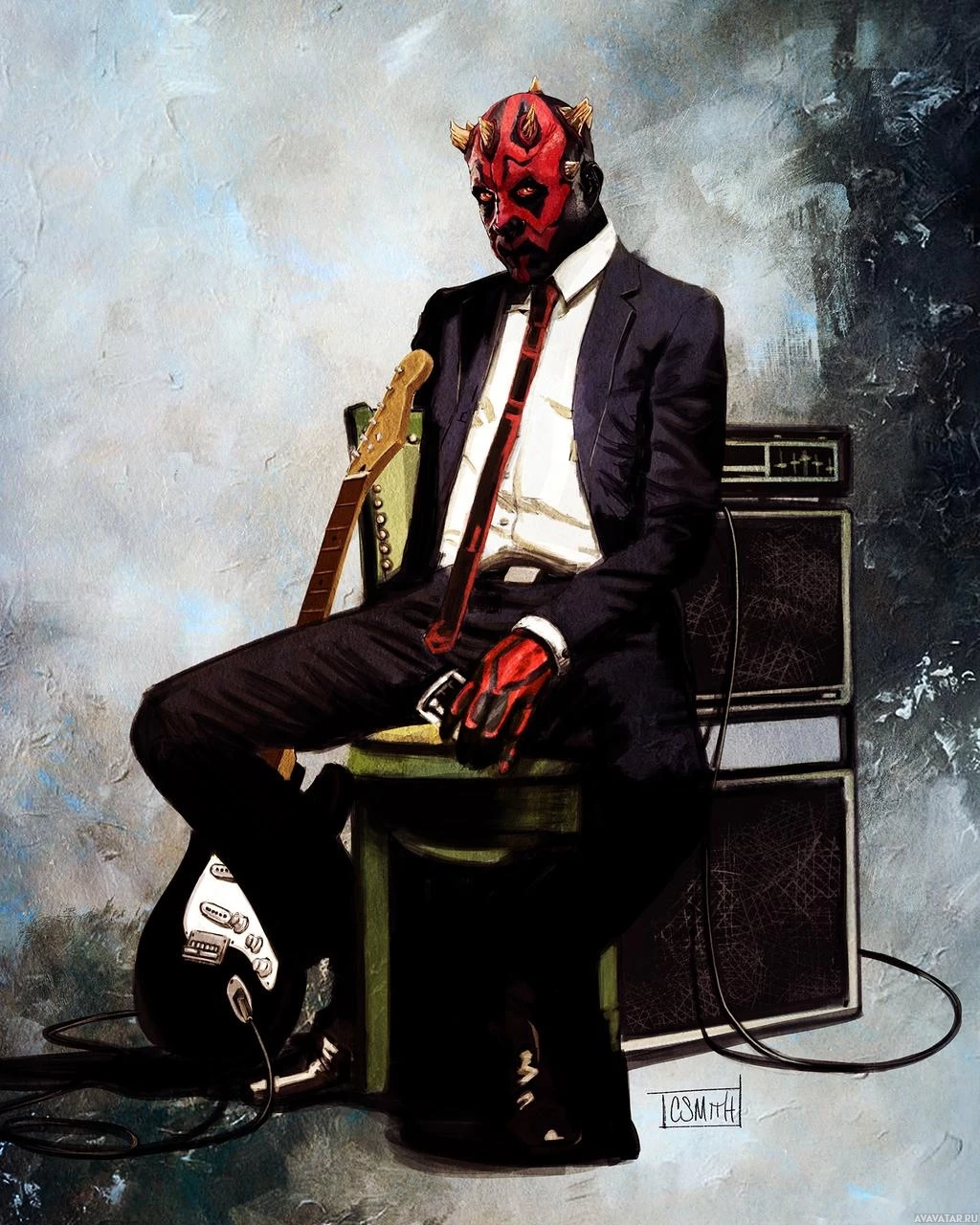 The image depicts a stylized illustration of Darth Maul, a character from the "