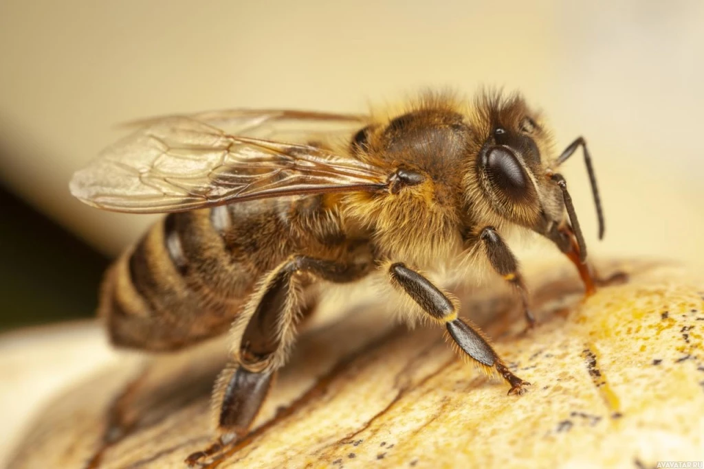 На картинке изображена пчела, которая одновременно является и насекомым, и животным. Похоже, что она находится на поверхности куска дерева или коры какого-либо вида дерева, возможно, собирает нектар или материал для своего улья.