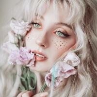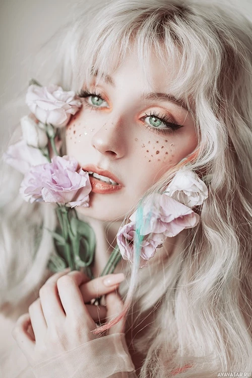 blonde hair and striking makeup, including vibrant blue eye shadow and glittery freckles on her face. She is holding a bunch of
