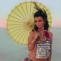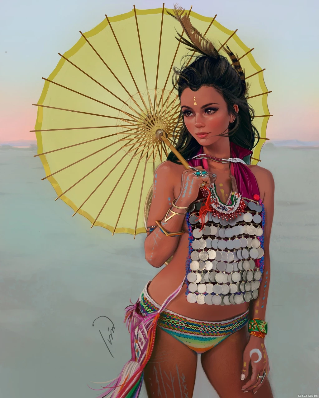 a traditional costume or attire, which may suggest a cultural or fantasy setting. Her outfit includes a top adorned with