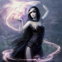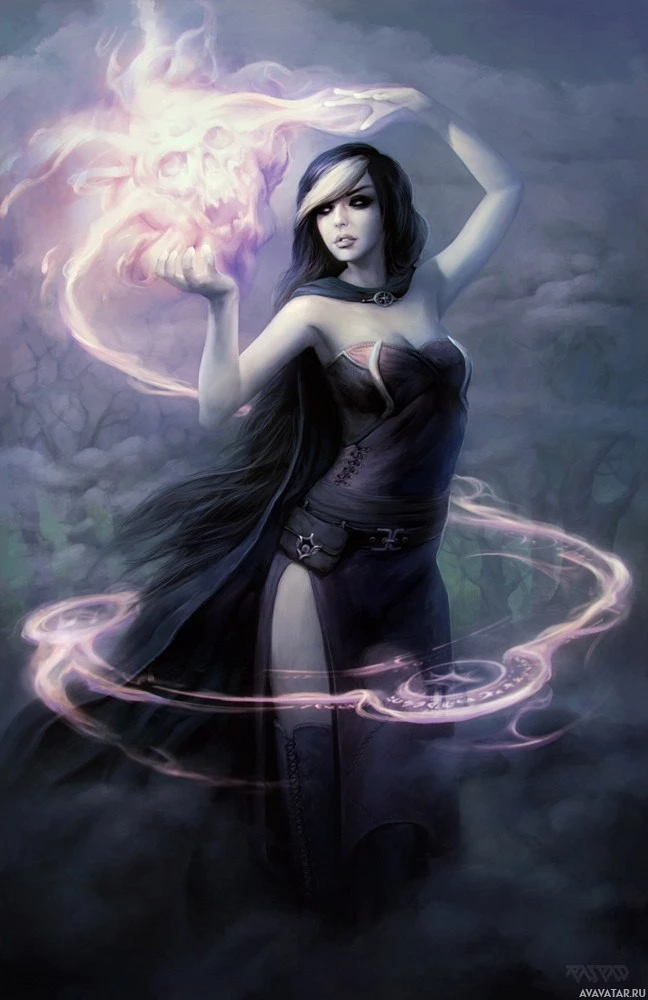 an illustrated character that appears to be a female mage or witch. She has long