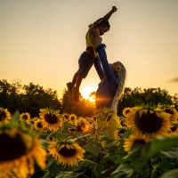 the warm lighting. The woman is holding the child who has their arms raised towards the sky. In the foreground, there are tall, bright yellow sunflowers, while in the background, silhouettes of trees can be seen against a fading