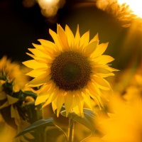 На картинке изображен подсолнечник в фокусе, фон размыт. Солнце садится, заливая сцену теплым светом и создавая эффект боке благодаря используемым настройкам камеры, которые мягко очерчивают края цветка и его лепестки.