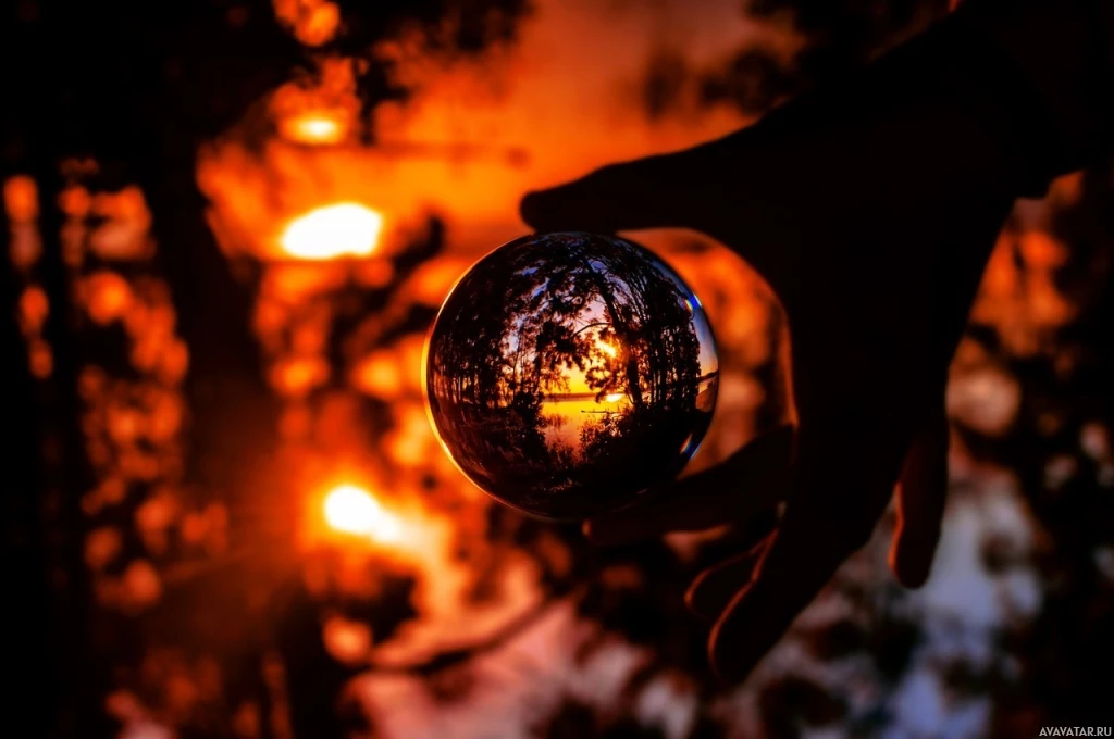 a spherical object, which appears to be a balloon. Inside the balloon, there is a reflection of a sunset scene with trees and
