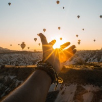 The image shows a hand reaching towards the sky at sunset or sunrise, with many