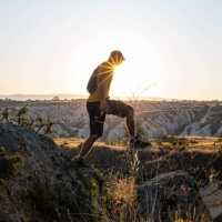 The image shows a person standing on what appears to be a cliff or hill, with the sun setting in the background. There are also several