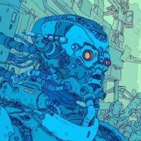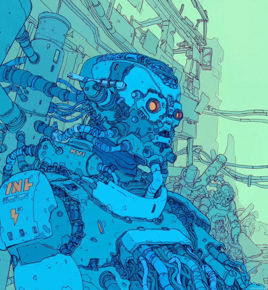 a science fiction or cyberpunk setting. It is depicted in a detailed, illustrative style with a color palette that gives it an otherworldly or futuristic appearance. The robot has mechanical parts and possibly artificial organs, suggesting