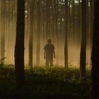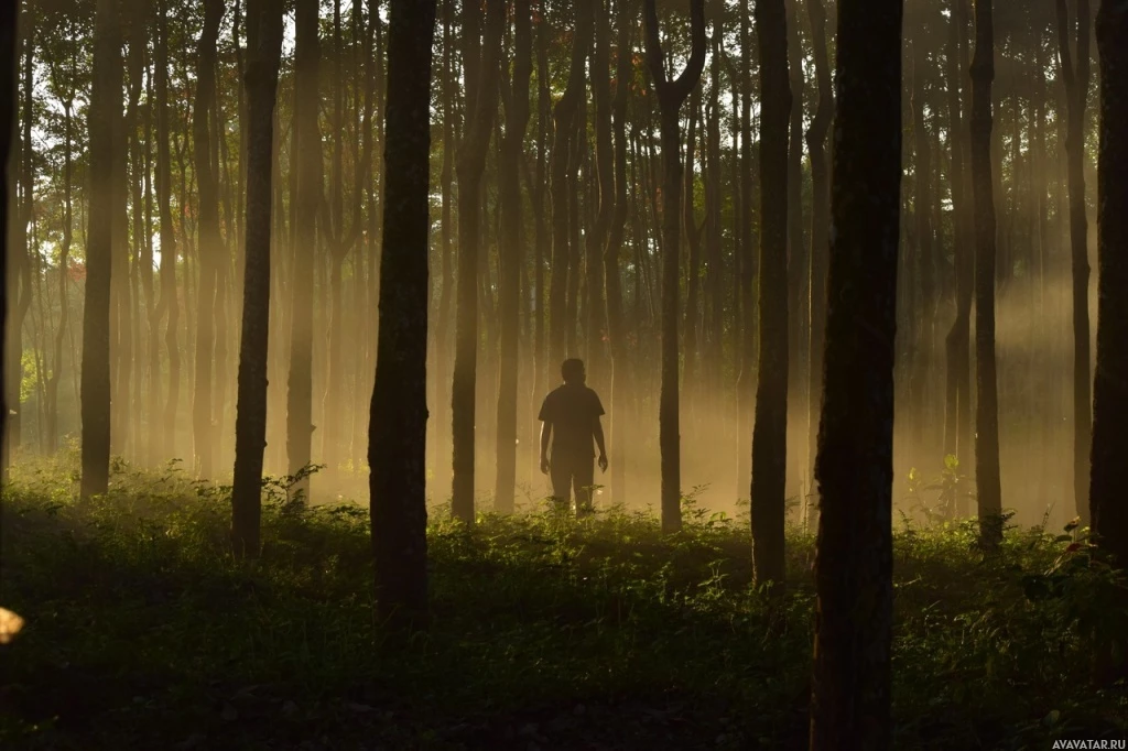 early morning or late afternoon, given the warm lighting and foggy atmosphere. There are trees on both sides of the path, creating a canopy that obscures much of the background. The overall effect is quite serene and mystical, with the person appearing as if they're walking through a magical,
