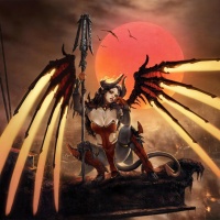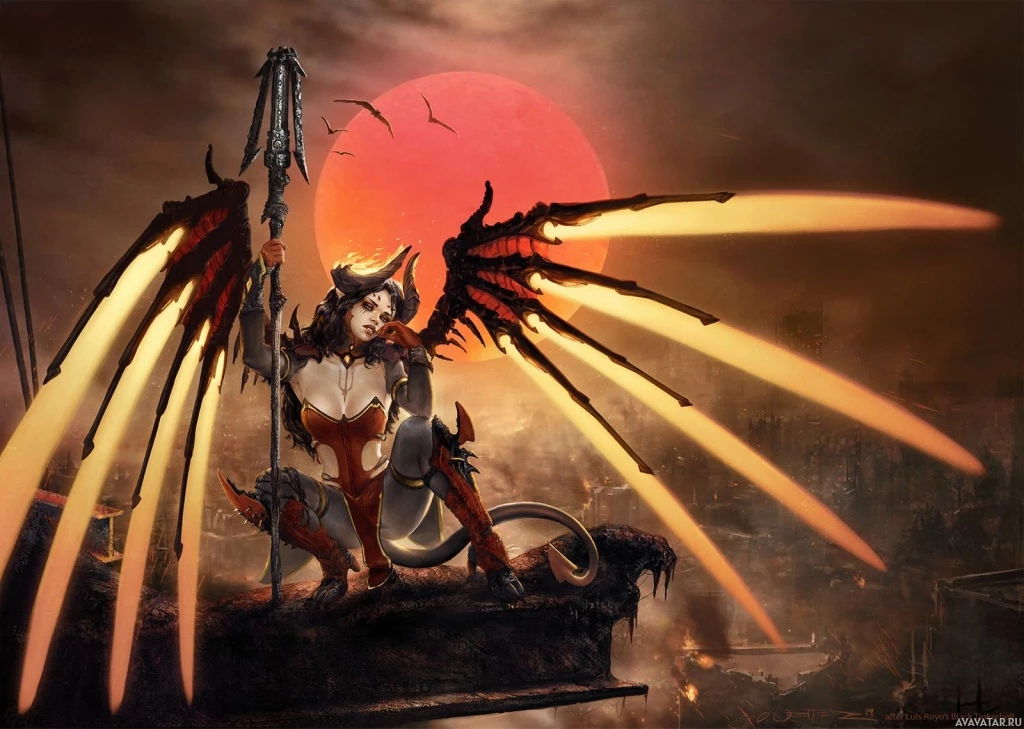 hero in the game. In this particular artwork, the character is shown with wings spread wide, holding what appears to be a staff or weapon with a flame-like emanation, set against a dark and ominous backdrop that could be inferred as a war-