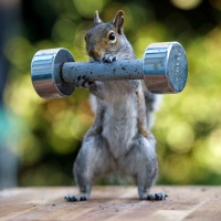 The image shows a small squirrel holding a silver dumbbell in its paws, as if it is performing an exercise or lifting weights. This scene plays on the human-like behavior of using weights for strength training and is likely meant to be humorous or cute.