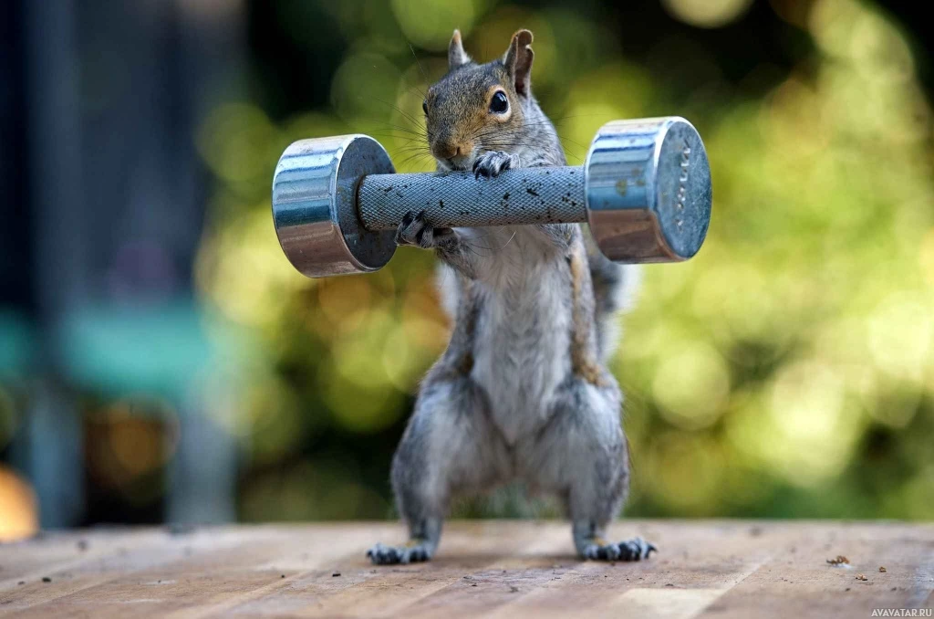 На картинке изображена маленькая белочка, держащая в лапках серебряную гантель, как будто она выполняет упражнение или поднимает тяжести. Эта сцена напоминает поведение человека, использующего гантели для силовых тренировок, и, вероятно, задумана как юмористическая или милая.