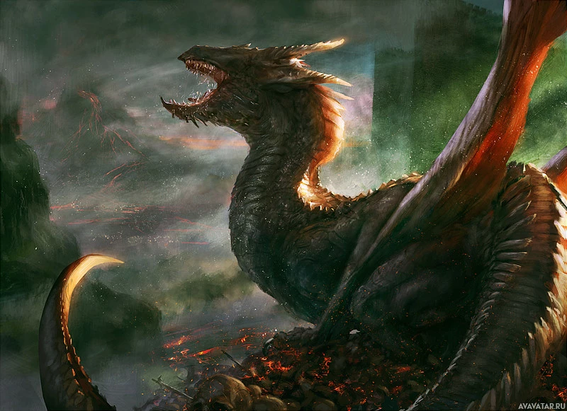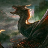 an aggressive manner. The artwork has a dark and dramatic color palette, with swirling clouds or smoke surrounding the dragon, which contributes to