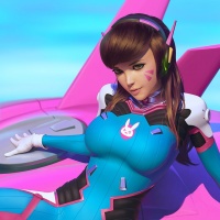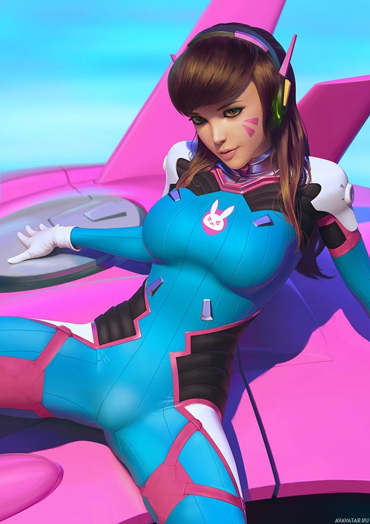 an animated character wearing a pink and blue suit with a helmet, representing the persona of D.Va from