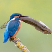 a spider web. The bird's colors are vibrant, with blue on its wings and tail, and orange on its body and face. There is no fish visible in this picture.