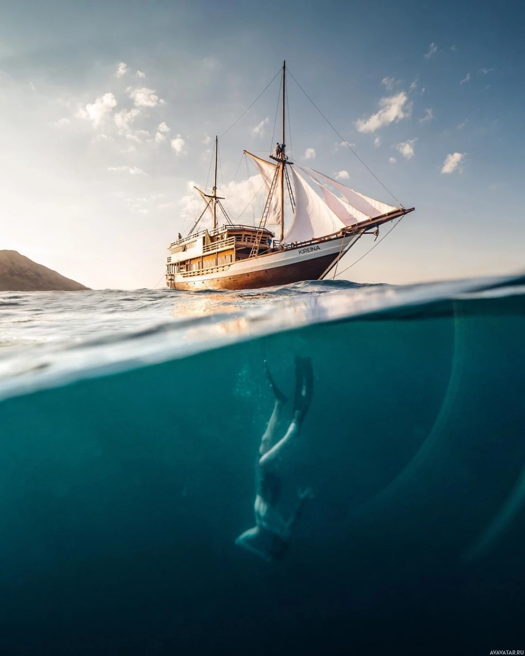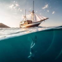 scuba gear, likely snorkeling or diving underwater near the boat. The boat appears to be a sailboat with its mast and sails visible above the water's surface, suggesting it might be in motion. The water looks clear and inviting for swimming or boating activities.