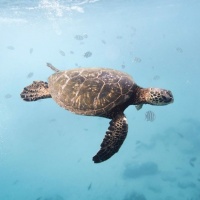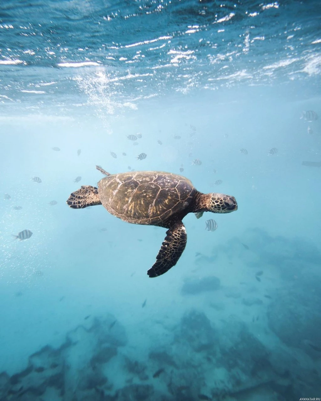 На картинке изображена морская черепаха, плавающая под водой. В воде вокруг черепахи видны различные мелкие рыбки, что указывает на то, что она, вероятно, находится в своей естественной среде обитания в экосистеме коралловых рифов.