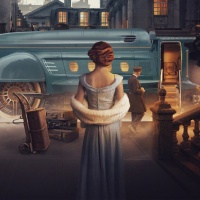historical attire, suggesting that the scene may be set in a bygone era. Her back is turned towards the viewer, and she seems to be looking over her shoulder at the train. The setting includes a station-like structure with