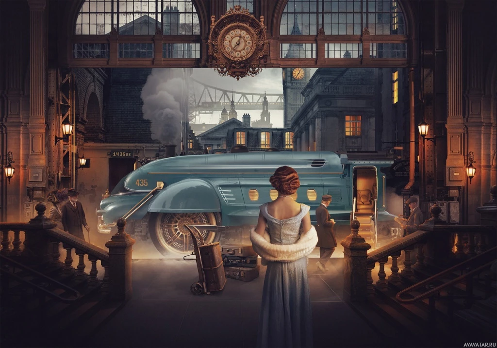 a clock on the wall behind her. The train itself is old-fashioned, featuring designs reminiscent of early