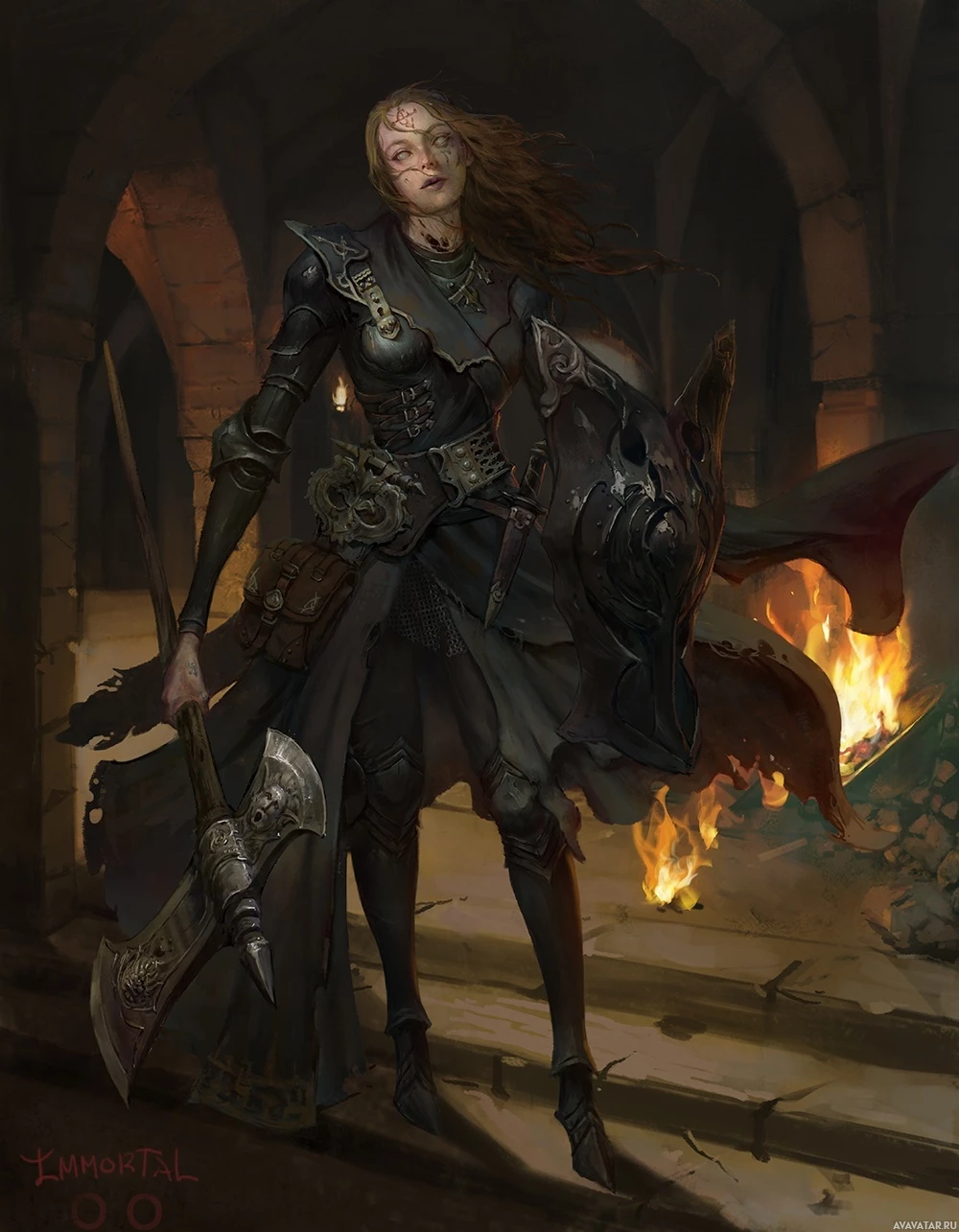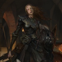 a female character dressed as a warrior or fantasy heroine. She is wearing armor with