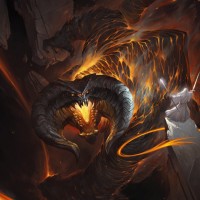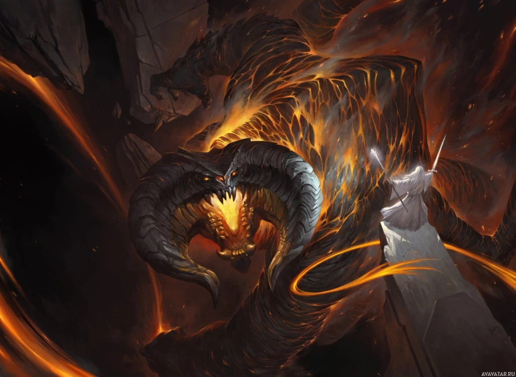 long claws, and is surrounded by flames, which is characteristic of these creatures, who are often associated with fire in the mythology of Middle-earth. The interaction between the two figures suggests a moment of confrontation or dialogue, as Gandalf faces the balrog amidst dramatic scenery that includes volcanic or fiery elements, which adds to the intensity of the scene.