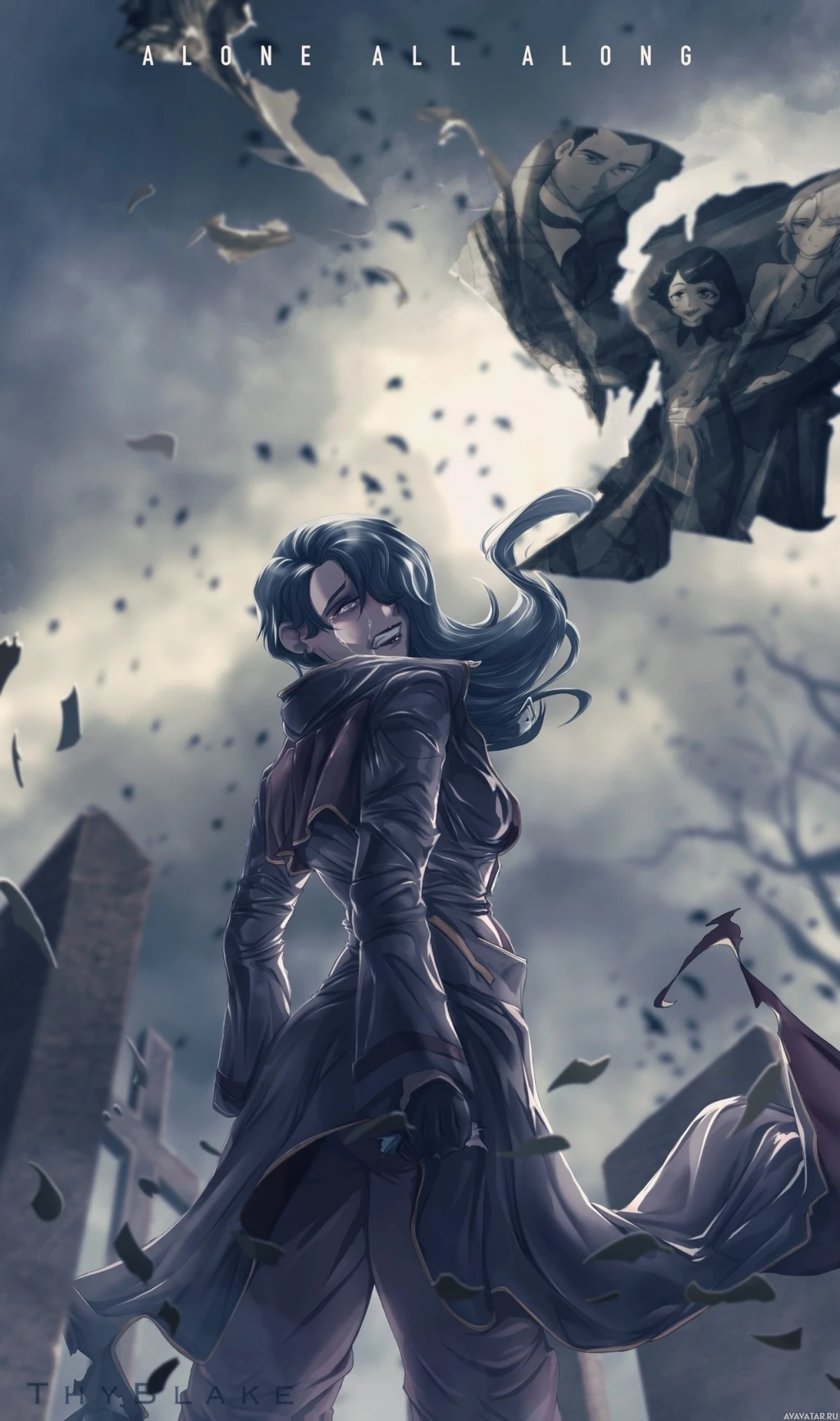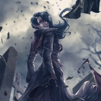 a dramatic sky, suggesting that she might be preparing for battle or has just finished one. The character is looking off to the side, giving