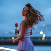 The image shows a woman from behind, holding a red rose in her hand. She appears to be blowing on the rose as if to make it bloom faster. The background suggests an evening setting with a bridge and some lights visible.