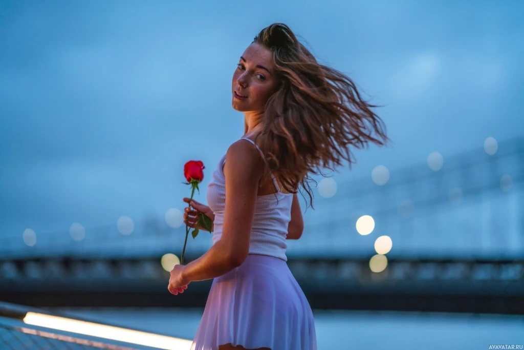 На картинке сзади изображена женщина, держащая в руке красную розу. Кажется, что она дует на розу, как бы заставляя ее быстрее распускаться. На заднем плане видна вечерняя обстановка, мост и несколько огней.