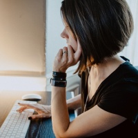 The image shows a woman sitting at a desk with a computer. She appears to be focused on the screen, and there is code visible on the monitor, suggesting she might be working on or reviewing some software development or coding tasks. Her hand is resting on her chin, which may indicate that she is deep in thought or problem-solving related to her work on the computer.