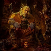 white hair and a beard, sitting in a natural setting that resembles a cave or rocky outcropping, complete with foliage and what seems to be a small skeleton nearby, adding to the fantasy atmosphere.
