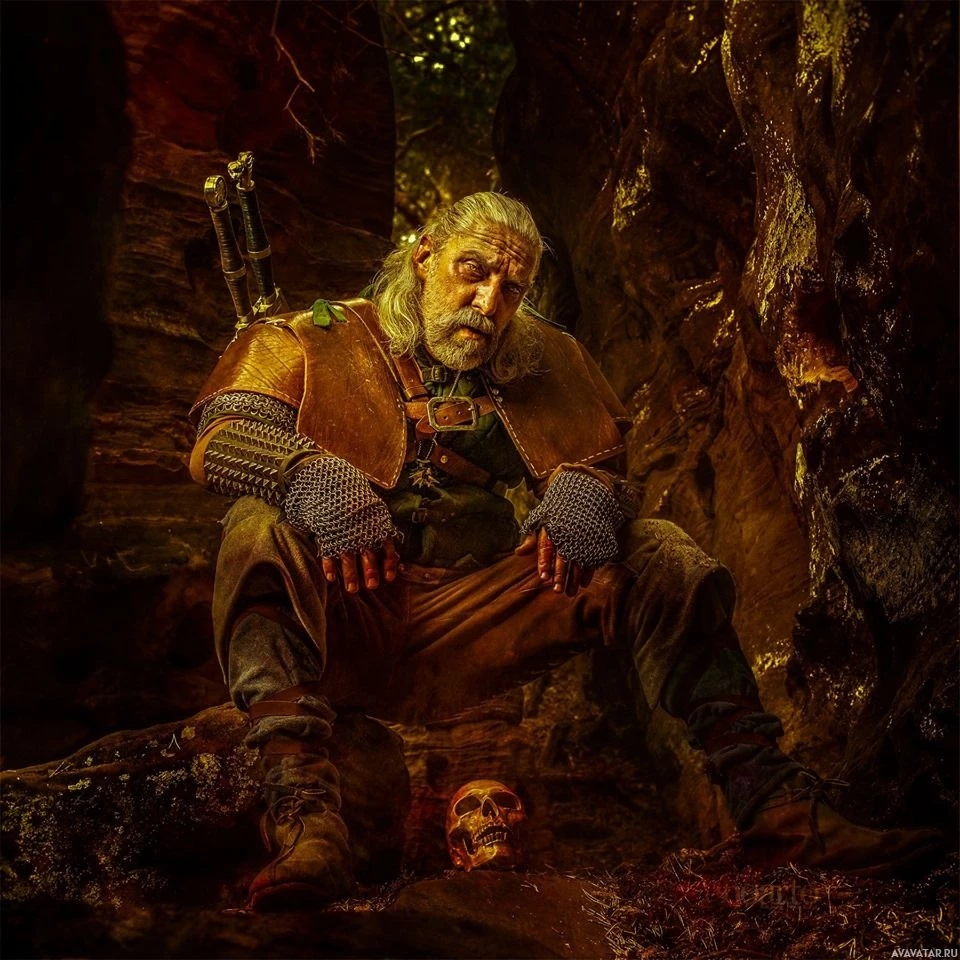 a cosplay of the character, portrayed with attention to detail, including clothing, armor, and props that match the design of the game. The character appears to be an older male with