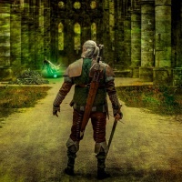 the video game "The Witcher 3: Wild Hunt." The character is standing in what appears to be an abandoned,