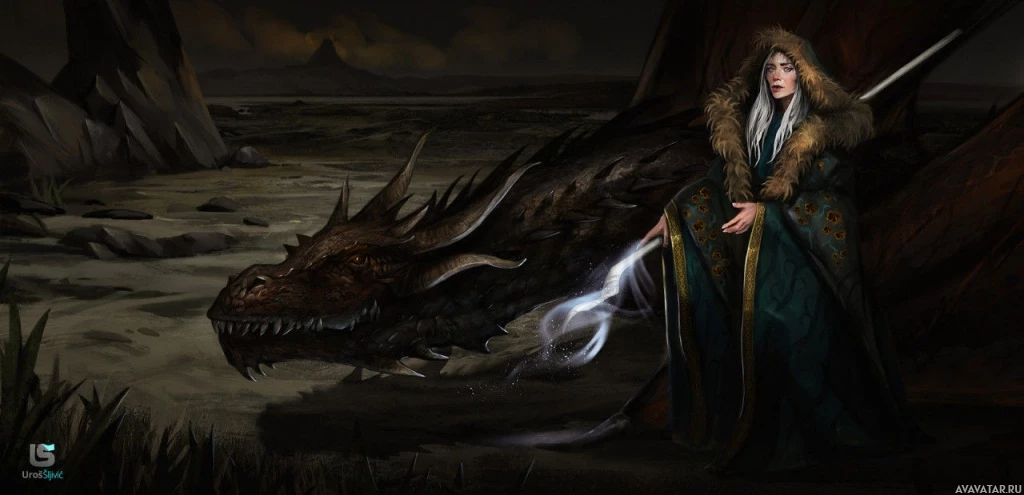 На картинке изображена фантастическая сцена с участием персонажа, который выглядит как девушка с посохом, стоящая перед драконом. Действие происходит на открытом воздухе, и атмосфера кажется драматичной, что, возможно, указывает на момент конфронтации или взаимодействия между персонажами. Стиль оформления предполагает, что оно может быть связано с играми или иллюстрациями в жанре фэнтези.