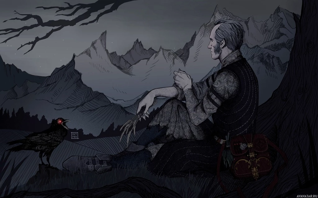 eerie atmosphere. In the foreground, there is a crow, which is