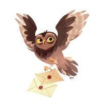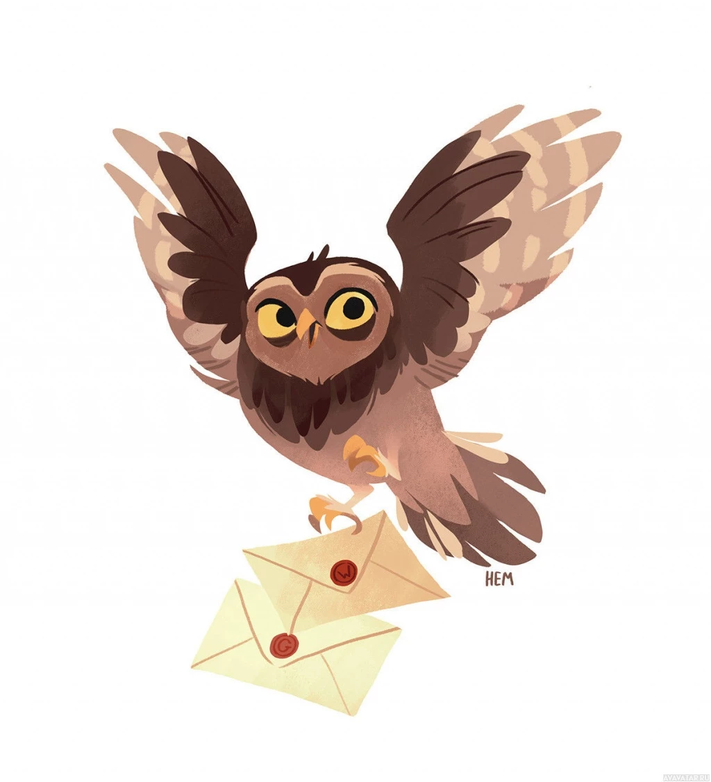 На картинке изображена сова с широко распростертыми крыльями, сидящая на письме. Сова изображена в мультяшном стиле и имеет несколько удивленное или любопытное выражение лица. Кажется, что она держит письмо лапками.