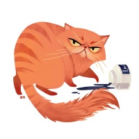 displeased expression on its face, which could suggest frustration or annoyance at the object it is interacting with. There are some visible drops of liquid around the cat's