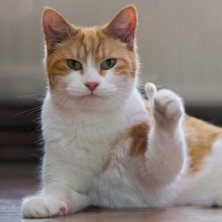 paws in the air. The cat appears to be relaxed and possibly playful, as it's giving what seems to be a "paw bump," which is a common gesture for cats to engage in