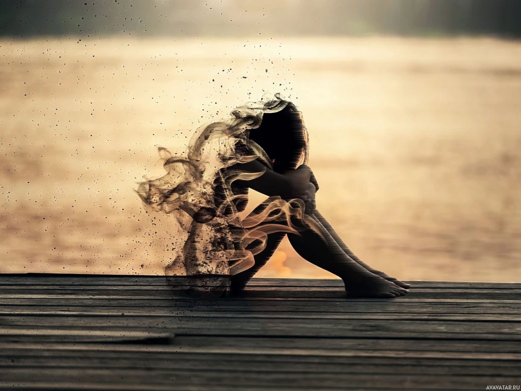 The image depicts a silhouette of a girl sitting on what appears to be a dock or pier beside