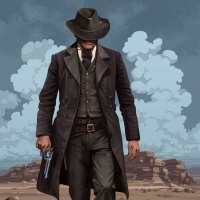 trench coat, a wide-brimmed hat, and a gun holstered on their hip. They are also holding a pistol in one hand. The character is set against a backdrop that suggests a desert or arid landscape with