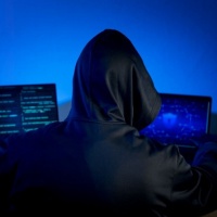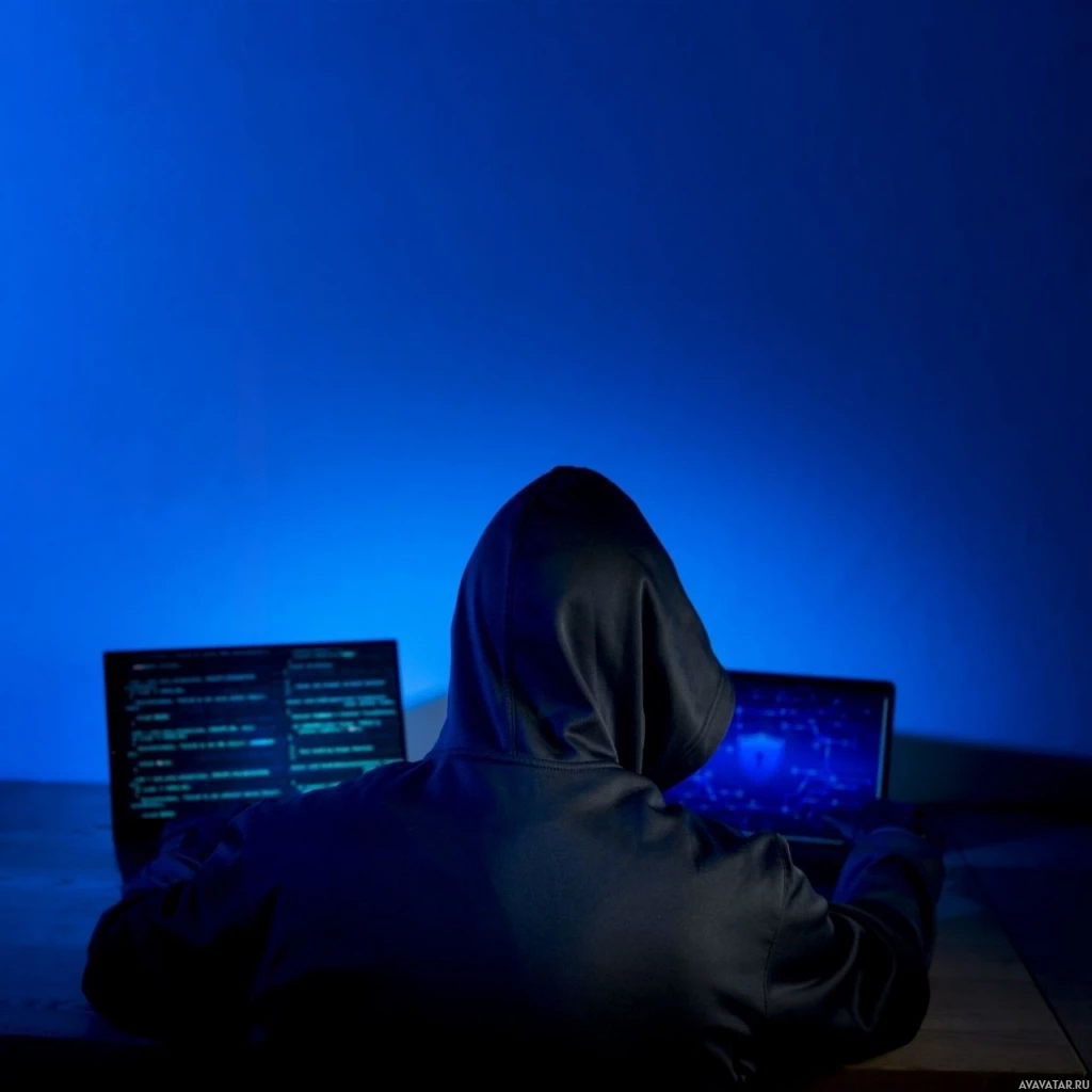 a blue glow in the background that could suggest the setting is late at night. The overall atmosphere suggests that this person may be involved in hacking or cybersecurity activities.
