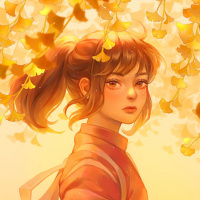 a neutral expression and is wearing what appears to be a traditional Chinese garment, possibly a cheongsam or similar clothing style. In the background, there are orange autumn leaves that seem to be falling around her, creating a warm,