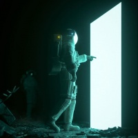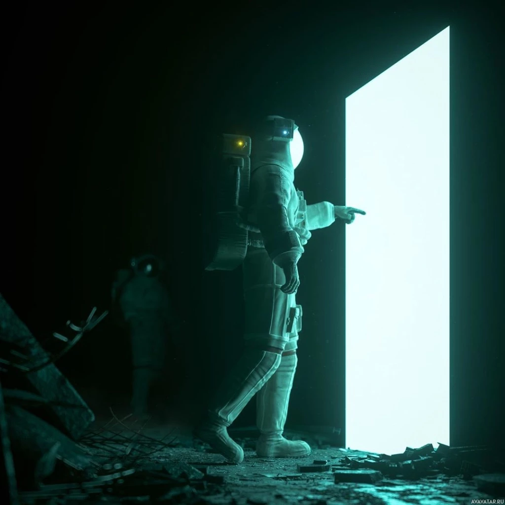 The image depicts an astronaut standing next to a large, glowing doorway that resembles a portal. The setting appears to be in space or on another planet, as indicated by the barren landscape and the presence of an additional figure in the background that seems to be wearing