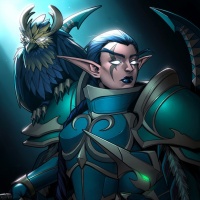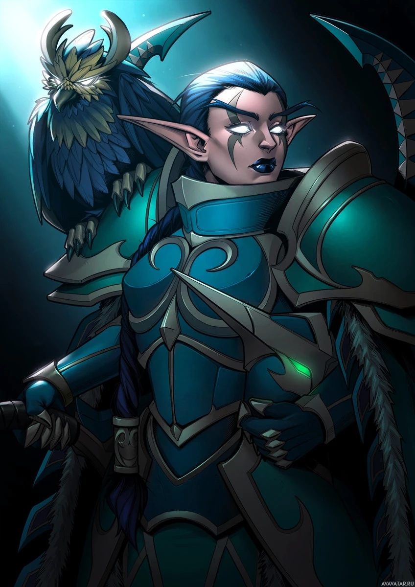 the pointed ears and other features characteristic of the fantasy race known as "elf" within the Warcraft universe. The character is wearing armor and carrying a bird on their shoulder, which could suggest they have