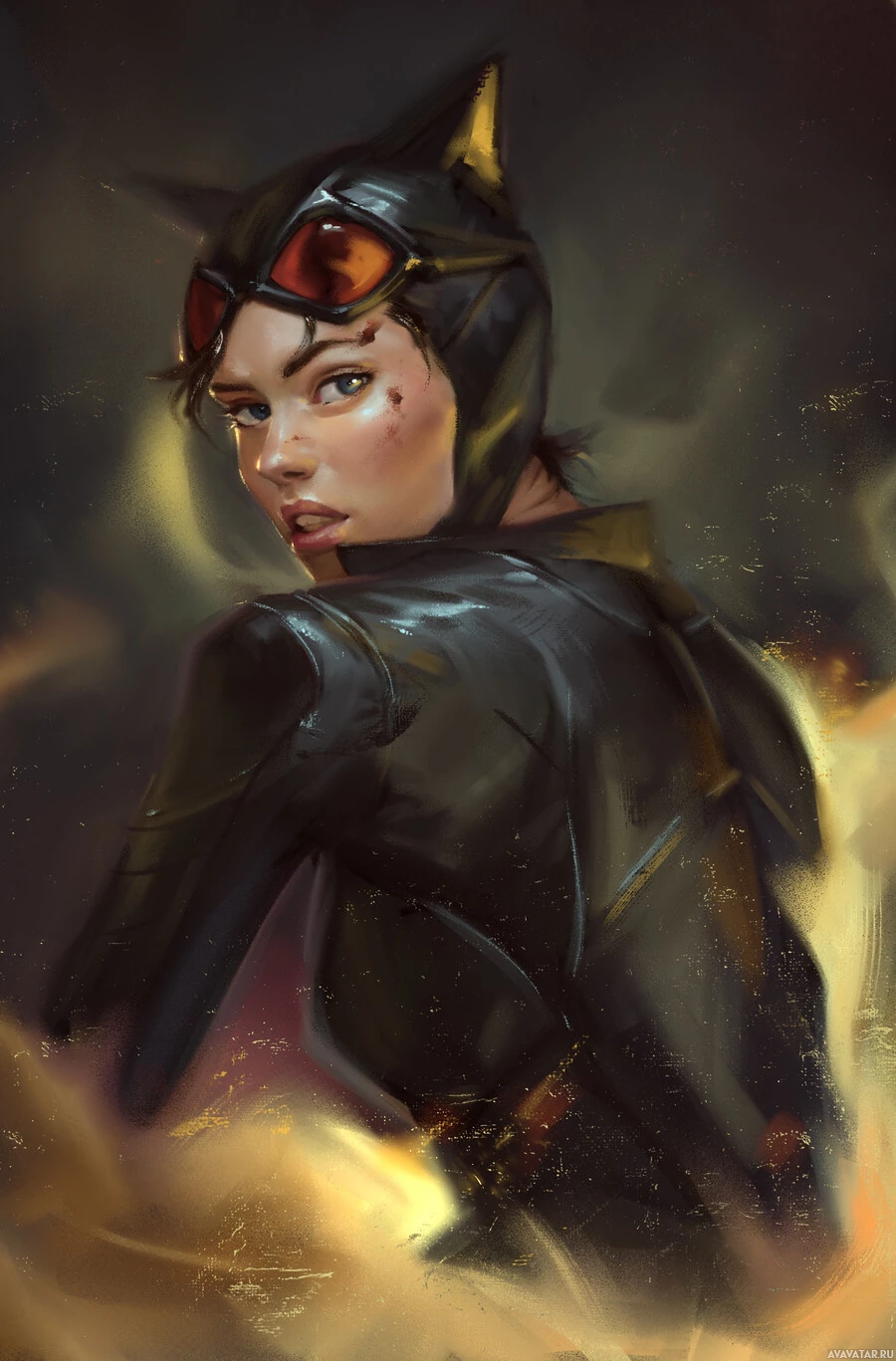 black suit and cowl, complete with goggles on her eyes. Her back is turned to the viewer, presenting a side