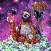 a fantastical scene with a cosmic background filled with swirling colors and clouds that resemble a nebula or galaxy. The sloth holds two items: a clock on one side and