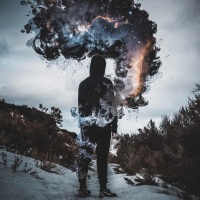a dramatic sky filled with dark clouds, which suggests an overcast or stormy weather condition. In the background, there are elements that resemble explosions or bursts of colorful energy or smoke against a starry